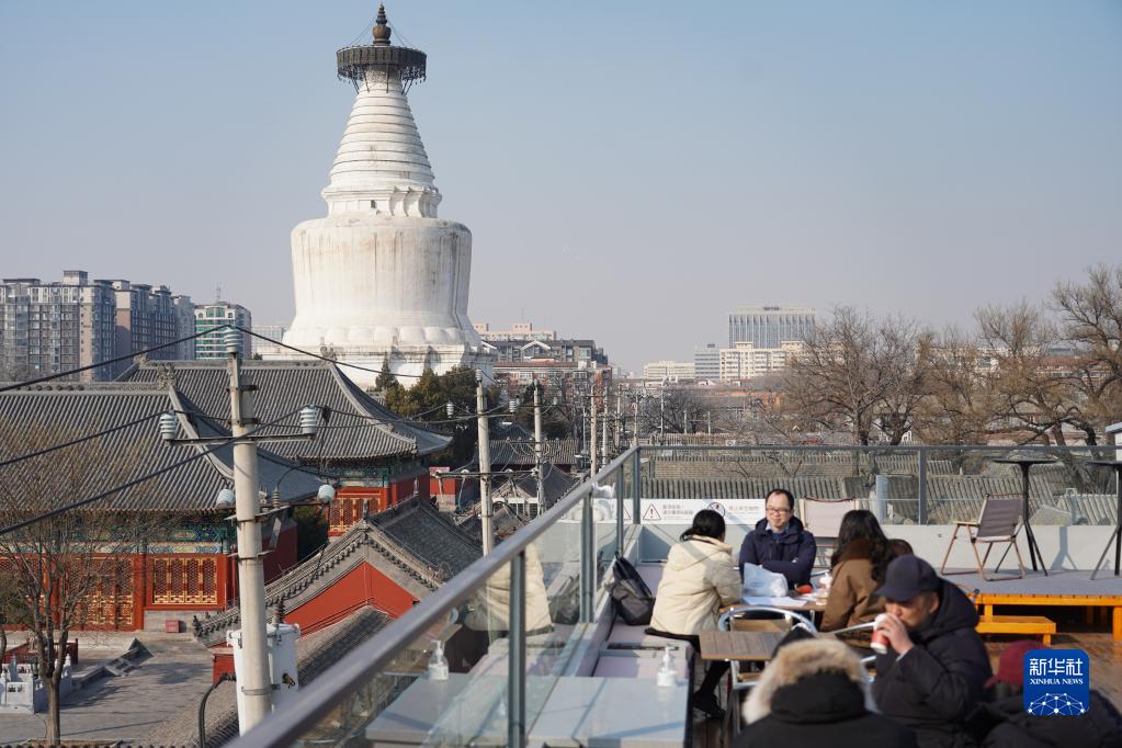 顧客在位于北京西城區的老字號白塔寺藥店樓頂品嘗飲品(2月22日攝)。