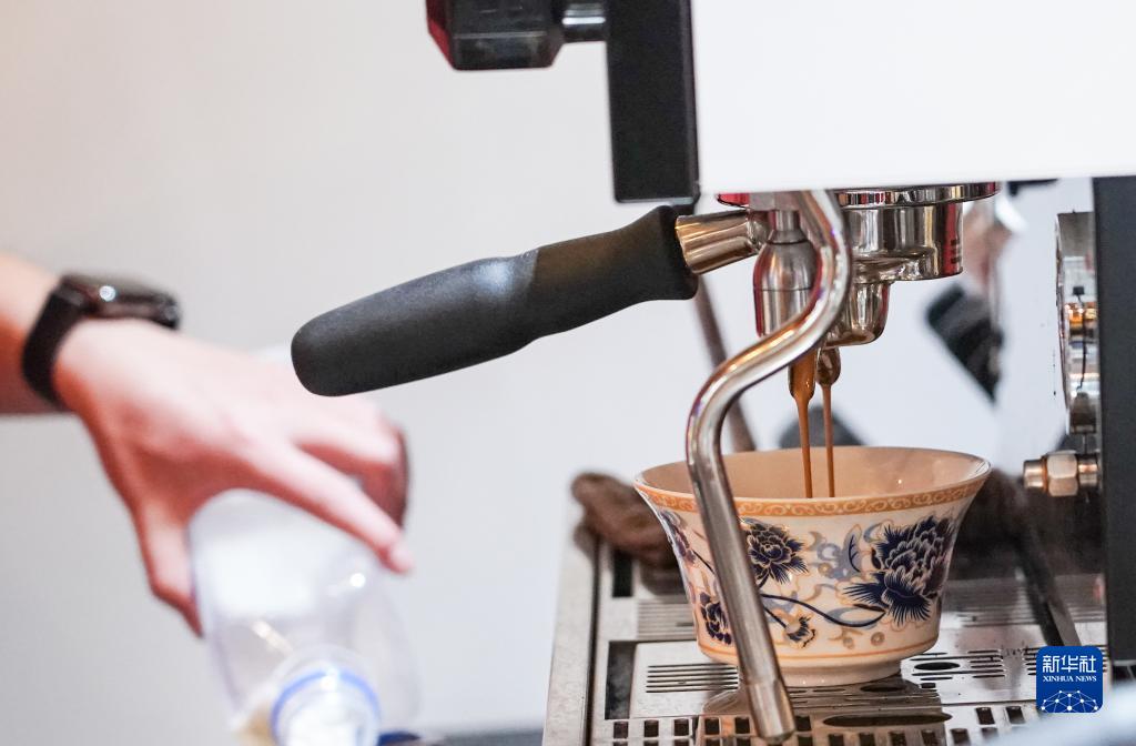 在位于北京大柵欄的內聯(lián)升“大內·宮?!笨Х葟d,工作人員用中式茶杯承裝濃縮咖啡(2月18日攝)。