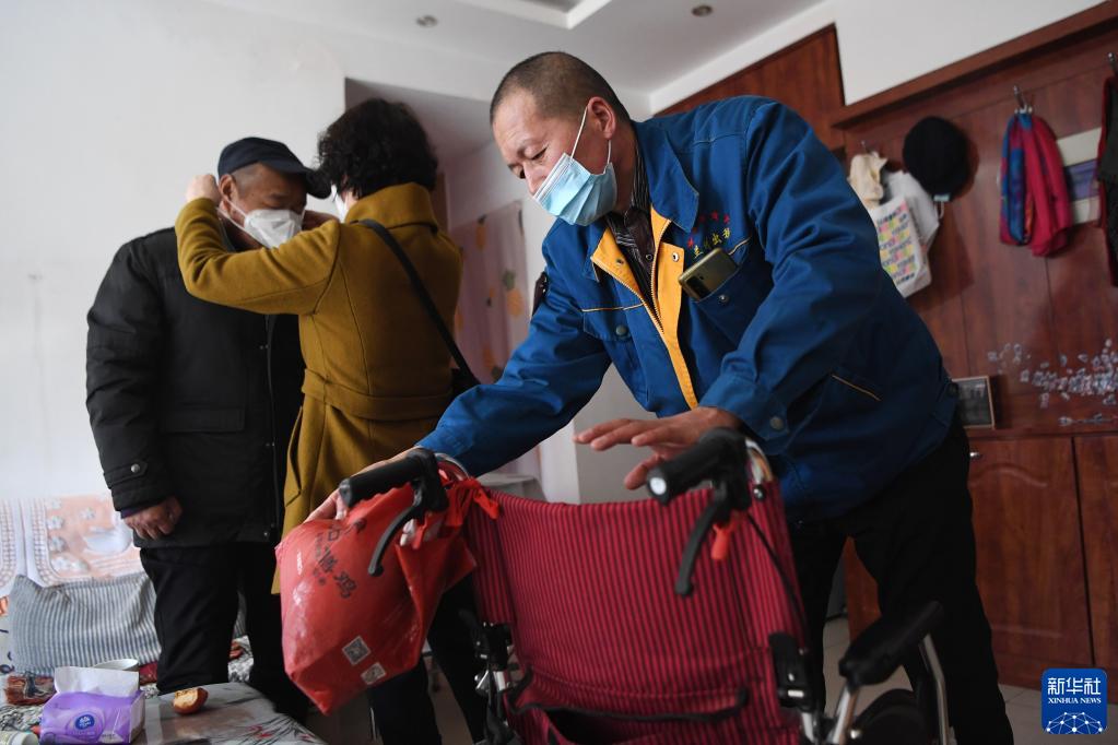 強漢紅(右一)上門(mén)為一位長(cháng)期患病的老人收拾輪椅,準備接送老人去醫院就醫(3月1日攝)。