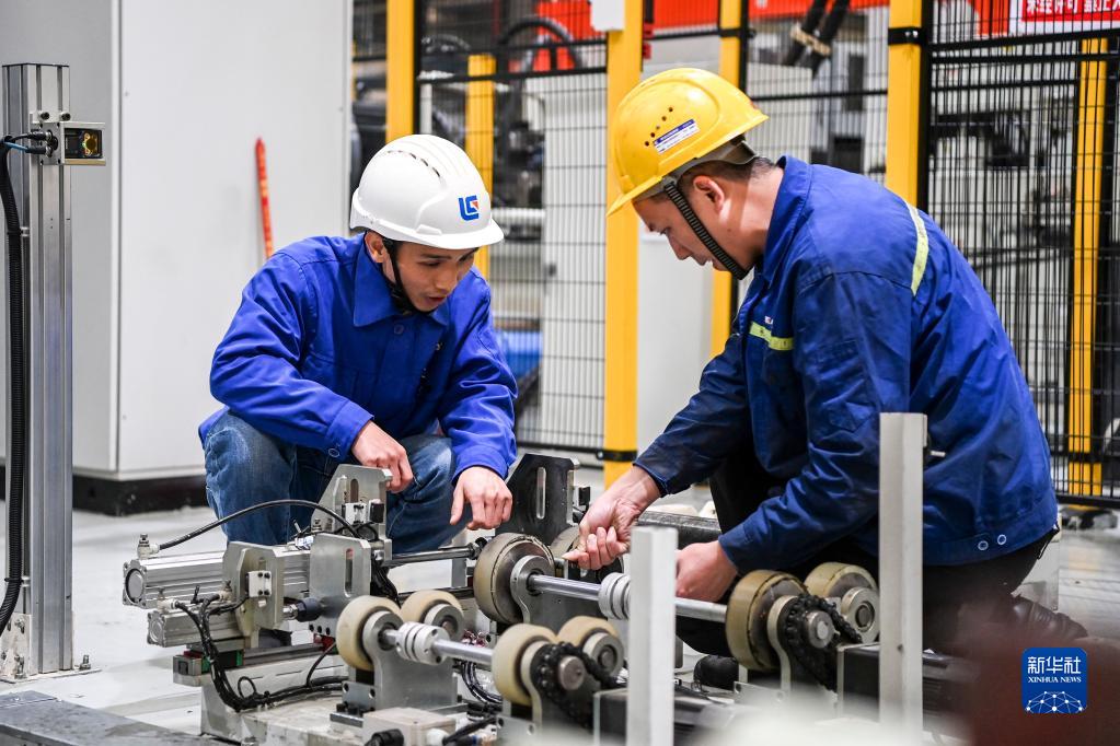 2月14日,在廣西柳工機械股份有限公司的生產(chǎn)車(chē)間內,周穎峰(左)與工友討論、處理生產(chǎn)過(guò)程中遇到的問(wèn)題。