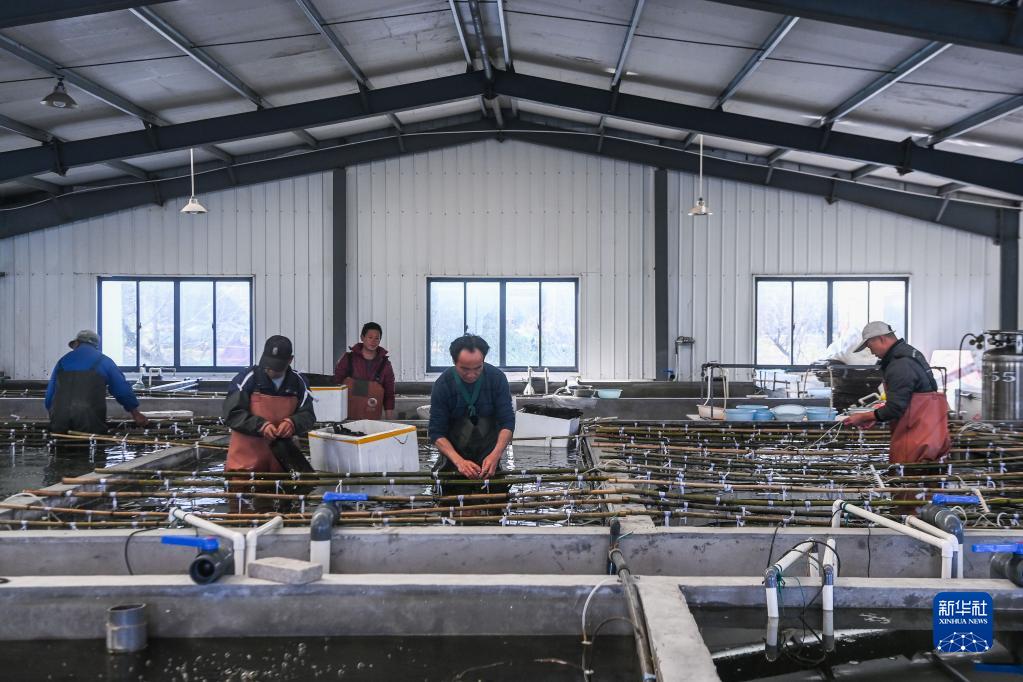 3月2日,在位于湖州市吳興區東林鎮保健村的湖旺水產(chǎn)基地孵化池內,工作人員將覆蓋著(zhù)魚(yú)卵的棕片小心地放到水池里進(jìn)行孵化。