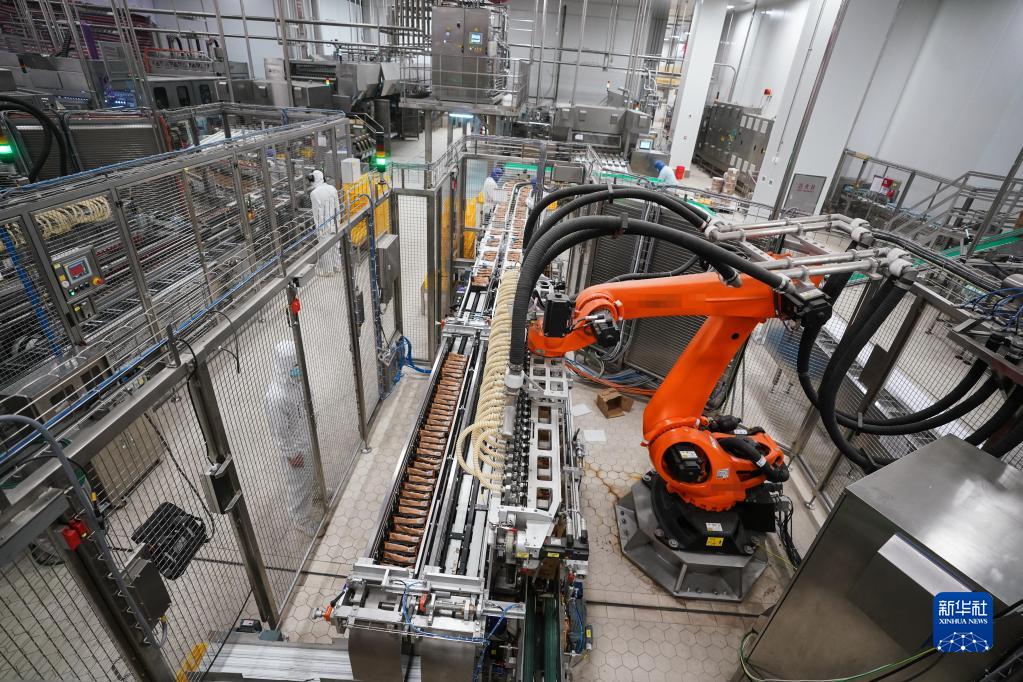 在夢(mèng)龍冰淇淋柔性生產(chǎn)線(xiàn)上,機器人對產(chǎn)品進(jìn)行裝箱作業(yè)(3月1日攝)。