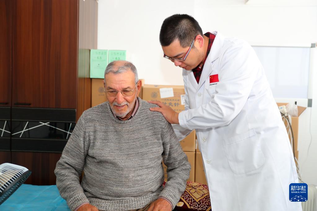 2月27日,在摩洛哥穆罕默迪耶,中國援摩醫療隊的針灸醫生沈含冰為一名老人做灸前檢查。