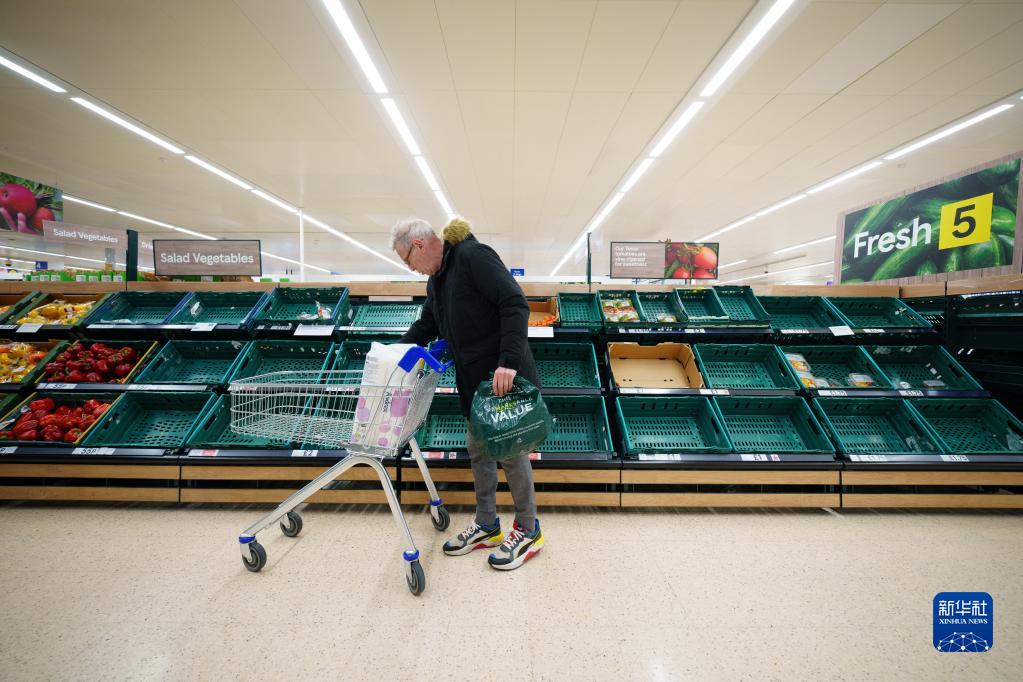 3月2日,在英國曼徹斯特,一家超市的蔬菜貨架出現缺貨。