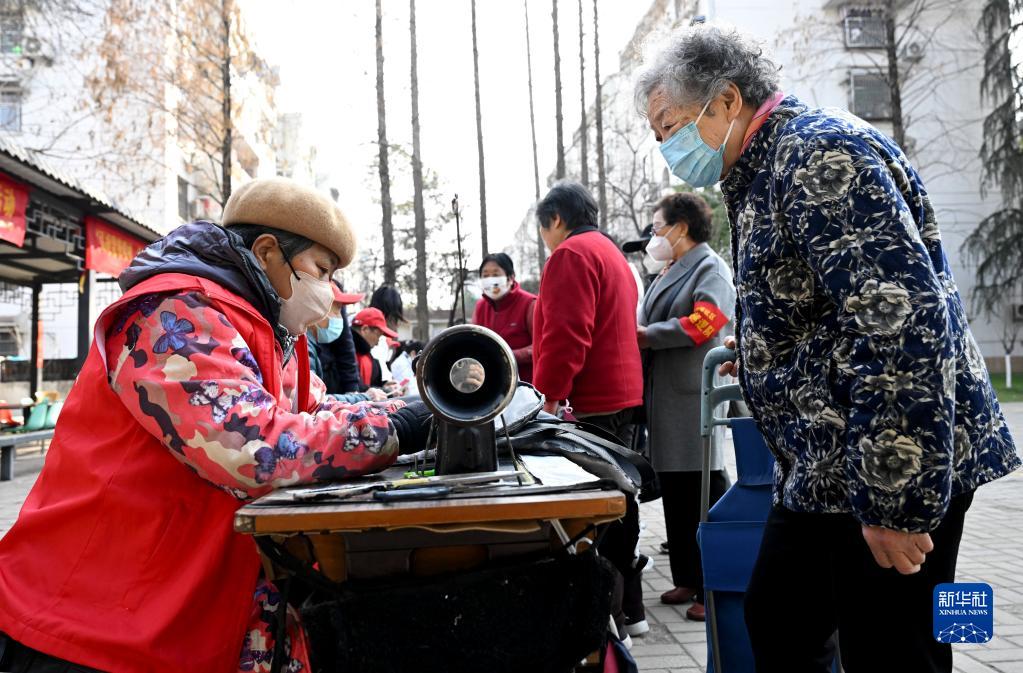 3月3日,在合肥市蜀山區琥珀街道琥珀潭社區,志愿者為居民縫紉衣服。