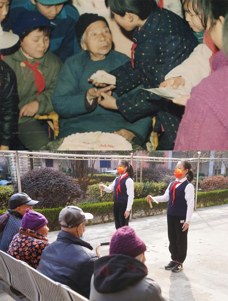 上圖:上世紀80年代,金沙小學(xué)五(2)雷鋒中隊隊員為孤寡老人慶祝生日(新華社發(fā));下圖:2月24日,金沙小學(xué)學(xué)生們?yōu)楫數鼐蠢显豪先吮硌莨澞浚ㄐ氯A社記者 季春鵬 攝)(拼版照片)。