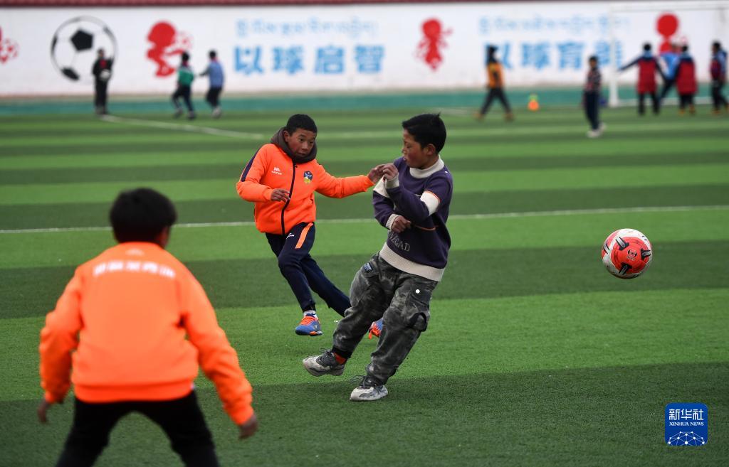 3月1日,在玉樹(shù)州曲麻萊縣第一完全小學(xué),曲麻萊青訓隊球員白瑪加(左二)在訓練課上。