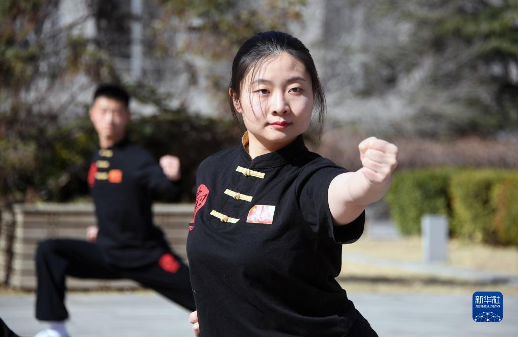 3月2日,在北京航空航天大學(xué),武術(shù)隊的隊員在校園內進(jìn)行長(cháng)拳訓練。