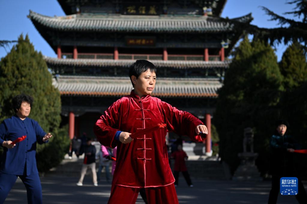 3月1日,在太原市迎澤區迎澤公園,市民在練習太極扇。