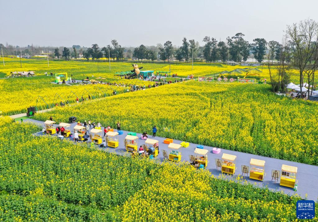 近日,位于四川成都崇州市的數萬(wàn)畝油菜花競相綻放,吸引游客前來(lái)踏春觀(guān)光。