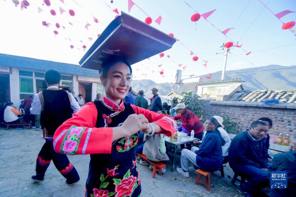 2月6日,魯麗華在南澗縣樂(lè )秋鄉農戶(hù)家進(jìn)行“彝族跳菜”表演。