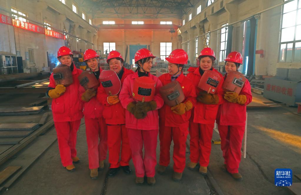 這是女子焊工班成員駱建寧、江遠芳、謝金穎、王喜蓮、李文靜、楊景愛(ài)、余容(從左到右)在焊接車(chē)間合影(2月27日攝)。