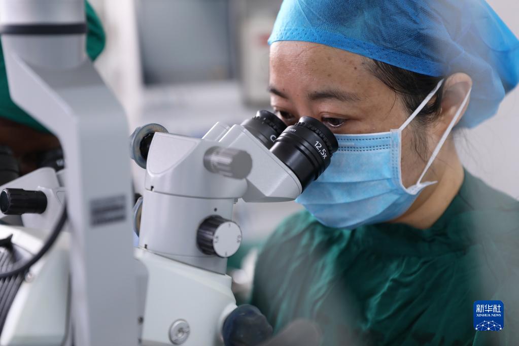 2月23日,在坦桑尼亞桑給巴爾島納茲莫加醫院,董莉莉為穆欣做白內障超聲乳化摘除手術(shù)。