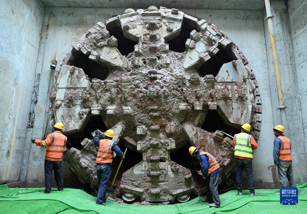 3月7日,在合肥軌道交通4號線(xiàn)南延線(xiàn)萬(wàn)佛山路站至明珠大道站區間中間風(fēng)井,工作人員對破洞而出的盾構機進(jìn)行清理。