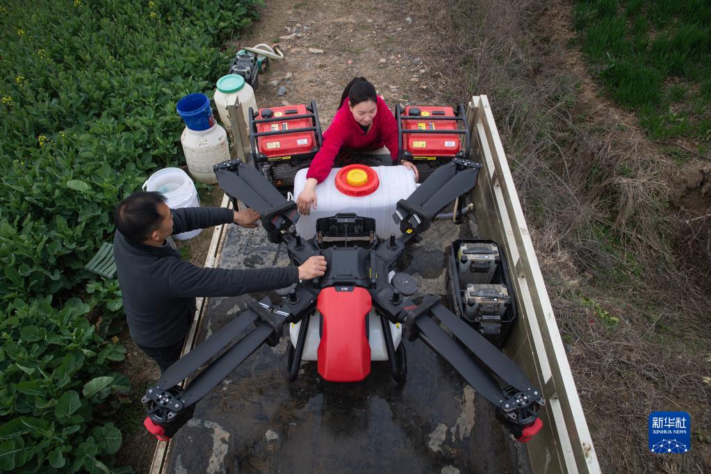 3月1日,女飛手吳玲(右)與丈夫準備利用植保無(wú)人機進(jìn)行噴藥作業(yè)。