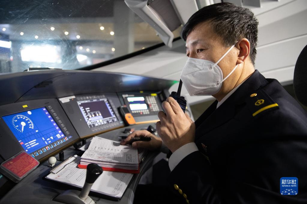 邢云堂在G924次高鐵列車(chē)駕駛室內與車(chē)站工作人員溝通(2月18日攝)。