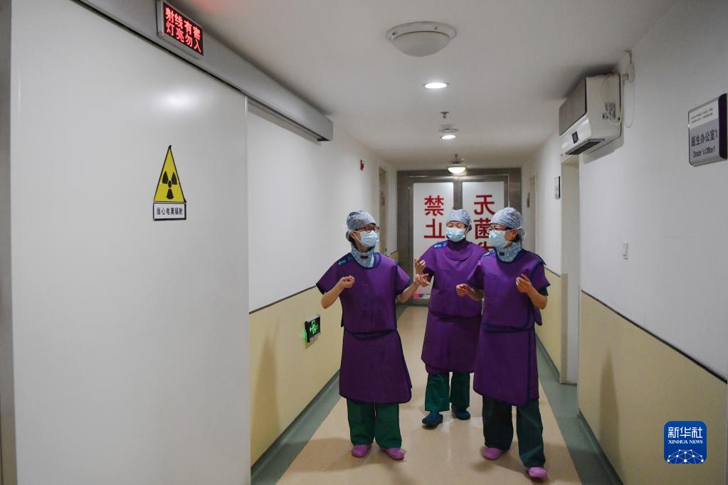 3月6日,穿上鉛衣的馬娜(左一)和同事準備進(jìn)入手術(shù)室。
