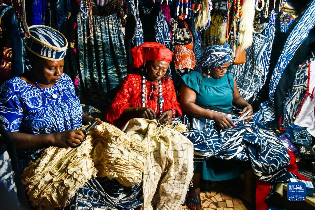 恩多普是主要流行于喀麥隆西部大區的一種布料,可以制成衣物、帽子和項鏈等。制作過(guò)程中,先用墨線(xiàn)在白色棉布上繪制紋樣,再用干燥的棕櫚葉脈做線(xiàn)把紋樣扎起來(lái),經(jīng)靛藍的植物染料浸染后,拆去棕櫚葉脈,便得到藍底白紋的恩多普。如今,眾多喀麥隆婦女投入恩多普制作領(lǐng)域,這不僅改善了她們的生活,也推動(dòng)了文化的傳承。