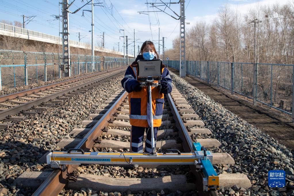 3月6日,大慶工務(wù)段杜爾伯特線(xiàn)路車(chē)間女子檢驗班的苑鵬鵬在濱洲線(xiàn)199公里處作業(yè)。