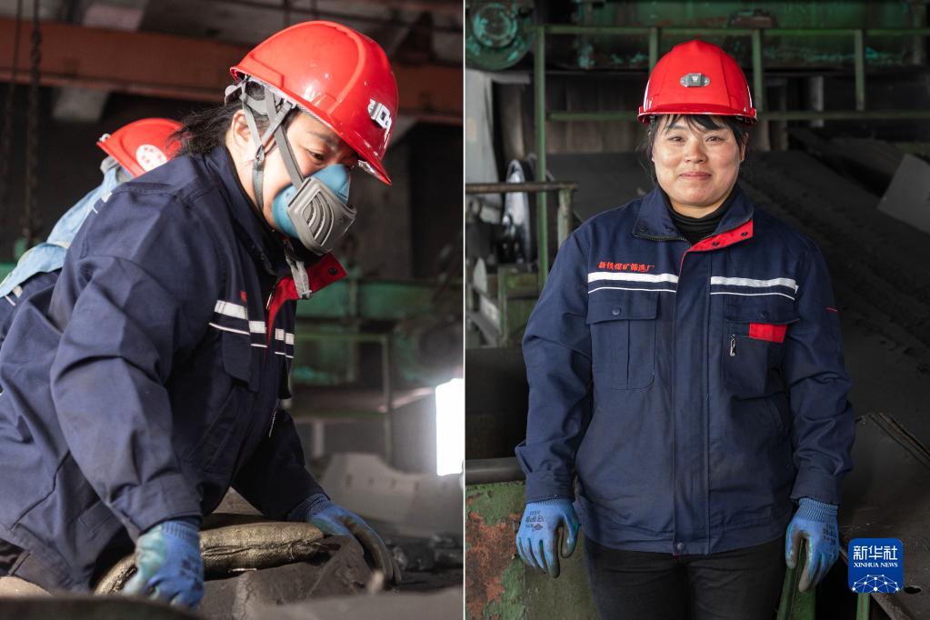 拼版照片:左圖為在黑龍江省七臺河市,龍煤集團七臺河礦業(yè)公司新鐵煤礦篩選廠(chǎng)手選班班長(cháng)曲兆香從動(dòng)態(tài)煤堆中挑選矸石;右圖,曲兆香在崗位上留影(3月7日攝)。