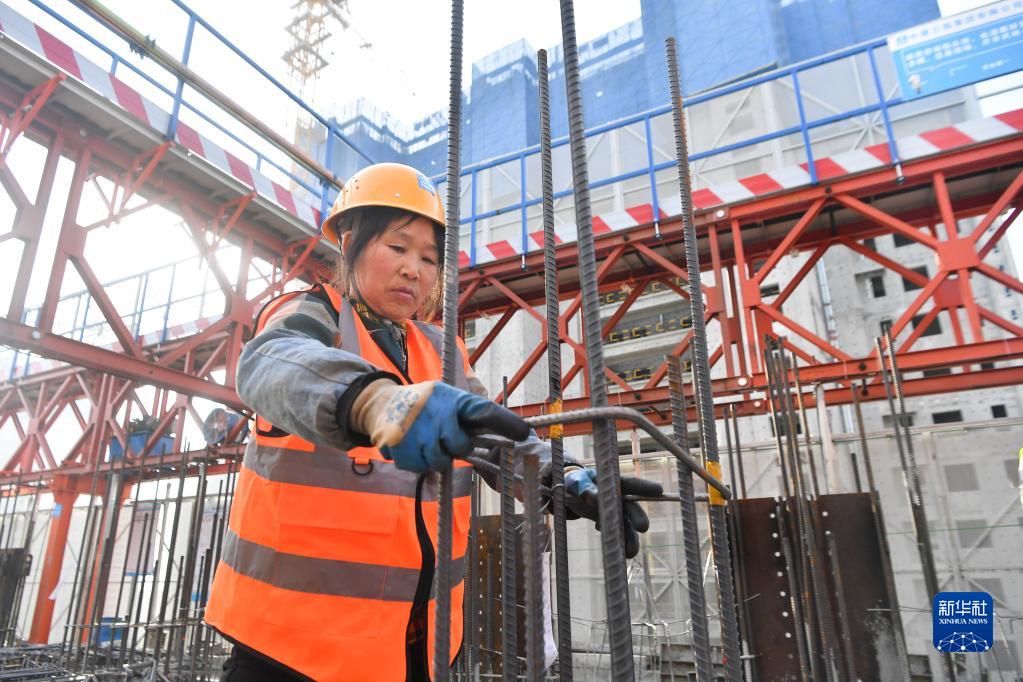 3月8日,在陜西省西安市未央區一處建筑工地,中建三局西北公司鋼筋工李華秀在施工現場(chǎng)工作。
