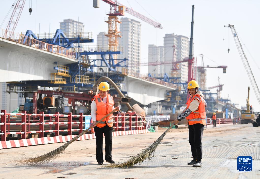 3月8日,在位于陜西省西安市國際港務(wù)區的水流路跨灞河大橋項目施工現場(chǎng),中建三局西北公司工人田小葉(左)、劉雪琴在施工現場(chǎng)工作。