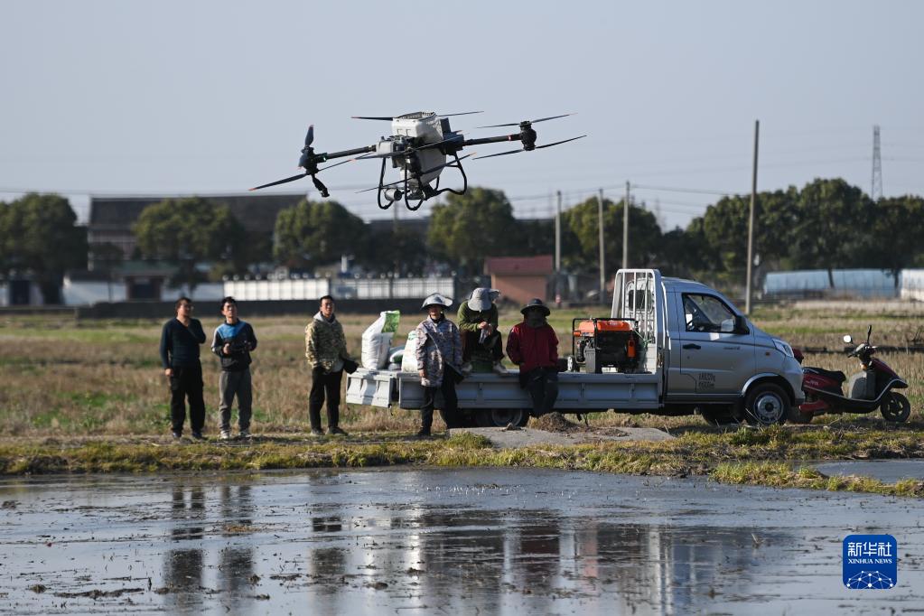 種糧戶(hù)在寧波市奉化區西塢街道四維村的水稻秧田操控植保無(wú)人機施肥(3月7日攝)。