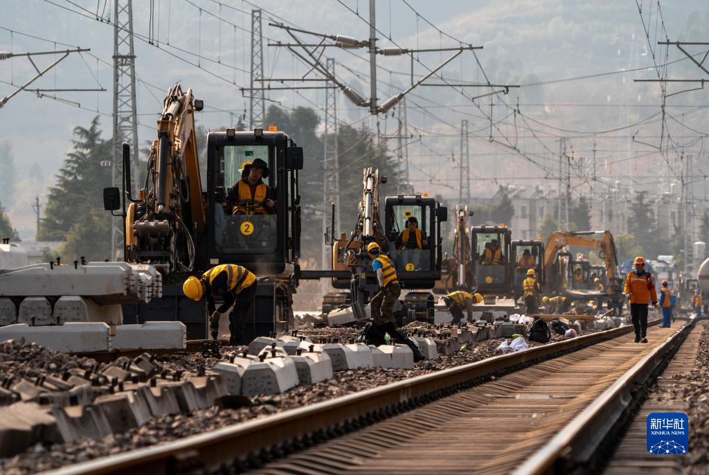作業(yè)人員操作換枕設備對鐵路進(jìn)行換枕作業(yè)(3月8日攝)。