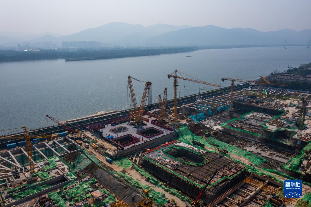 空中俯瞰富春江畔秦望通道工程過(guò)江隧道江北工作井施工現場(chǎng)(3月9日攝,無(wú)人機照片)。