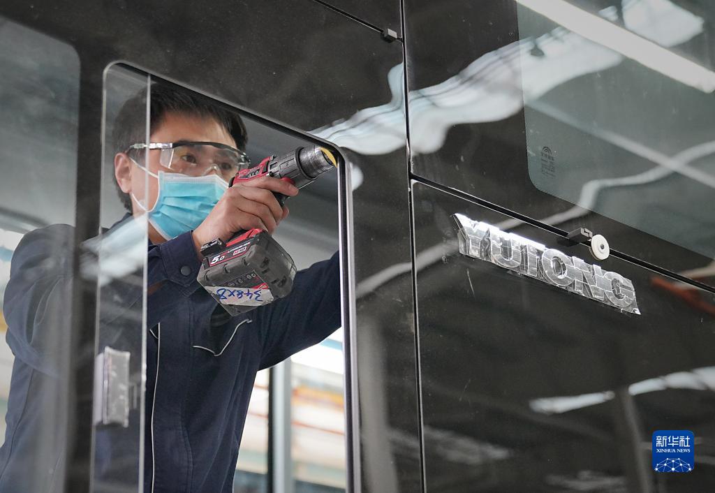 3月8日,工作人員在宇通新能源廠(chǎng)區高端及海外承裝車(chē)間裝配車(chē)輛內飾。