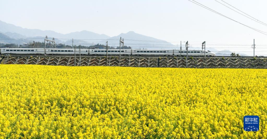 時(shí)下,在貴州省黔東南苗族侗族自治州,油菜花陸續盛開(kāi),動(dòng)車(chē)組列車(chē)穿行其間,美不勝收。