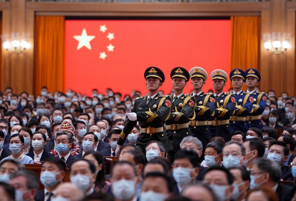 3月10日,中華人民共和國第十四屆全國人民代表大會(huì )第一次會(huì )議憲法宣誓儀式在北京人民大會(huì )堂舉行。這是陸??杖妰x仗兵正步行進(jìn)。