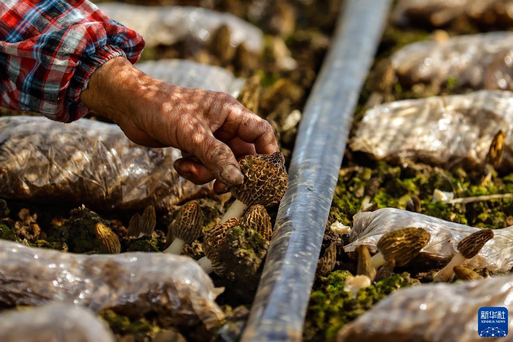 在四川省成都市大邑縣新場(chǎng)古鎮燈籠社區的一處種植大棚里,當地村民在采摘羊肚菌(3月8日攝)。