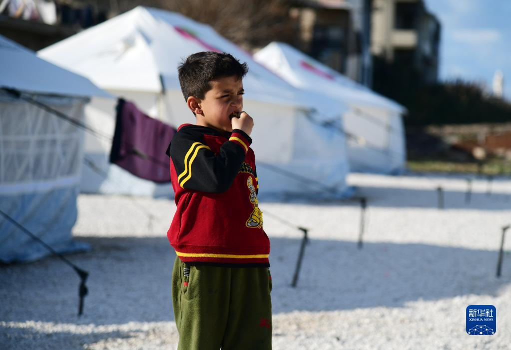 這是3月9日在敘利亞杰卜萊的一處災民安置營(yíng)內拍攝的兒童。