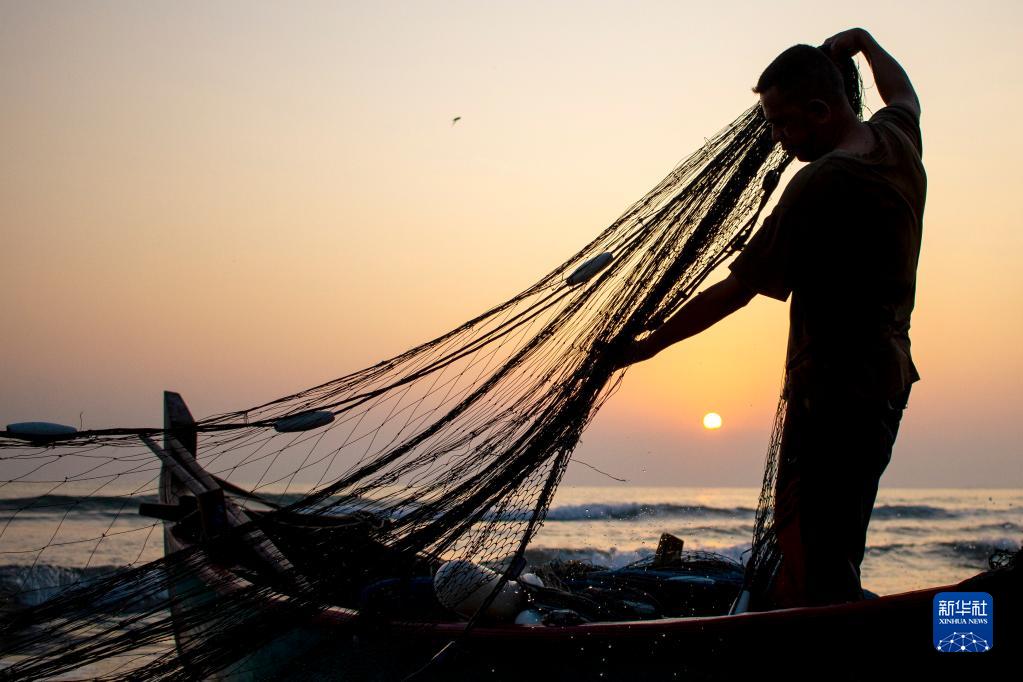 3月7日清晨,漁民在印度尼西亞亞齊省司馬威的海岸邊整理漁網(wǎng)準備出海捕魚(yú)。
