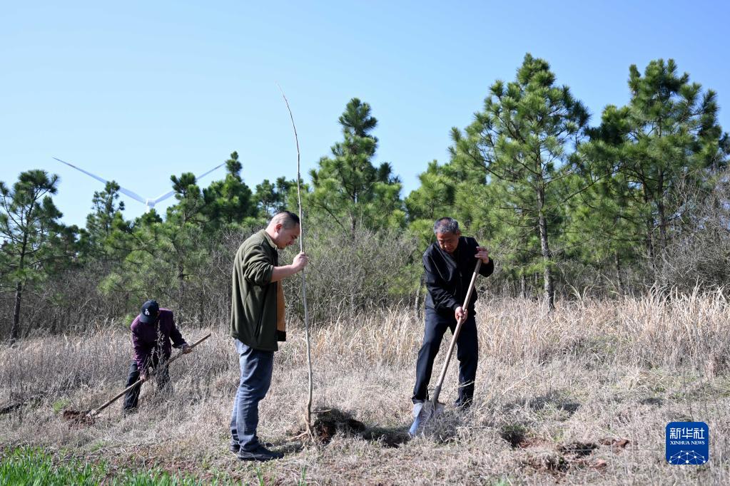 3月10日,張偉(右一)在陸沖山栽樹(shù)。