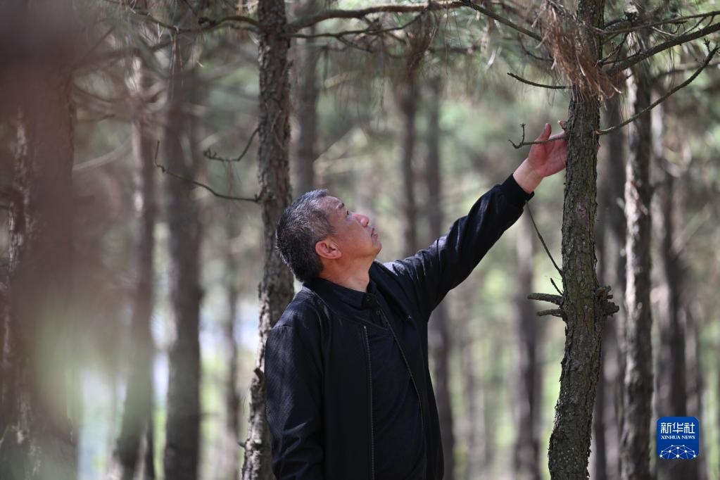 3月10日,在五河縣朱頂鎮陸沖山的山林中,張偉在觀(guān)察樹(shù)木的生長(cháng)情況。