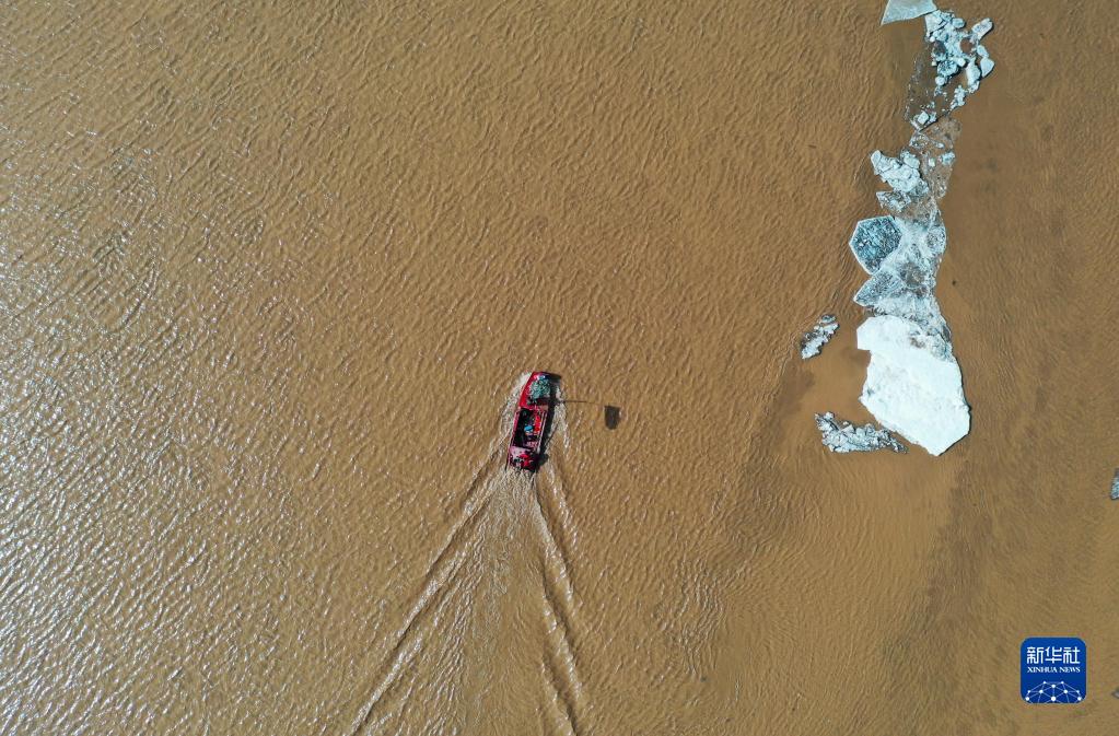 3月11日,在呼和浩特市托克托縣,一艘船在黃河水面上航行(無(wú)人機照片)。