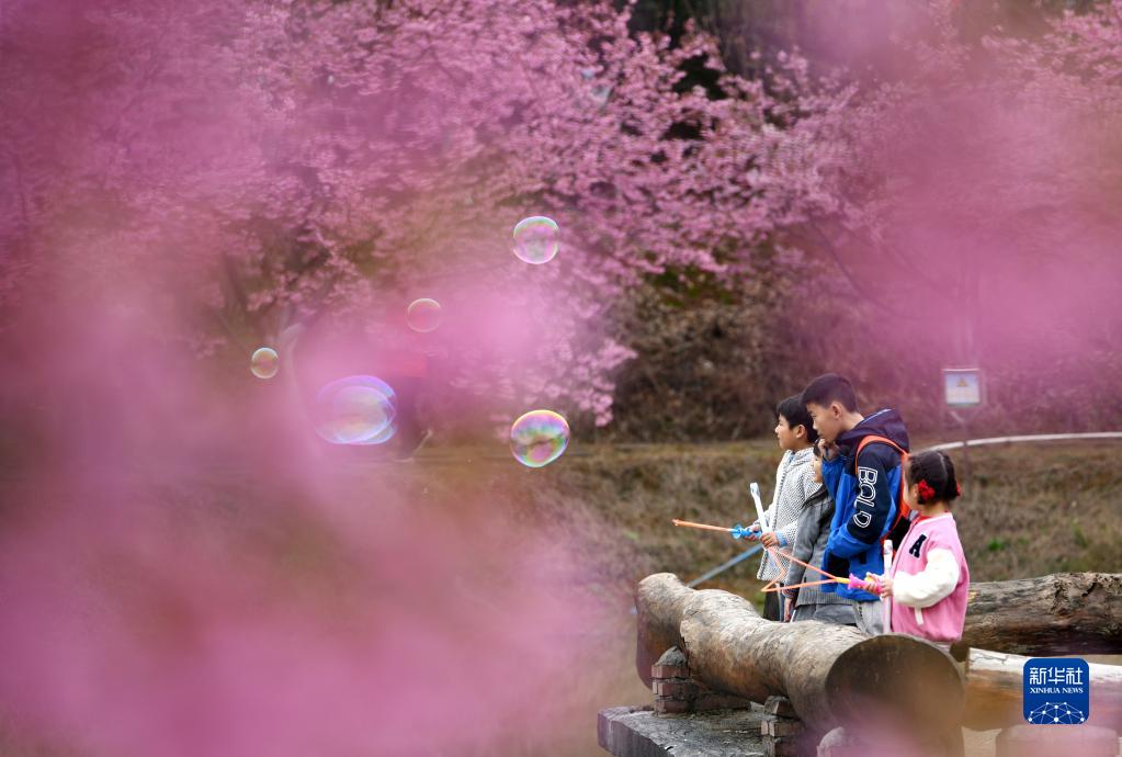 3月4日,小朋友在湖南省常寧市羅橋鎮櫻花園內玩耍。