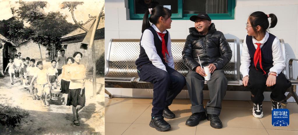 左圖:上世紀60年代,金沙小學(xué)五(2)雷鋒中隊隊員幫助軍烈屬打水(新華社發(fā));右圖:2月24日,金沙小學(xué)學(xué)生們和當地敬老院老人聊天(新華社記者 季春鵬 攝)(拼版照片)。