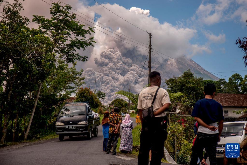 3月11日,在印度尼西亞日惹,人們望向噴發(fā)的默拉皮火山。