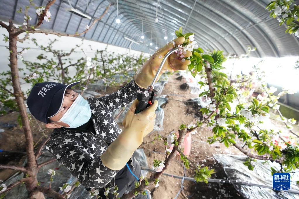 3月9日,在黑龍江省佳木斯市郊區現代農業(yè)產(chǎn)業(yè)園區棚室內,工作人員在給櫻桃樹(shù)人工授粉。