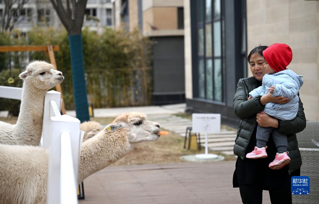 3月11日,在天津市薊州區“eden春山里”生態(tài)教育國際生活示范區,游客在和羊駝互動(dòng)。