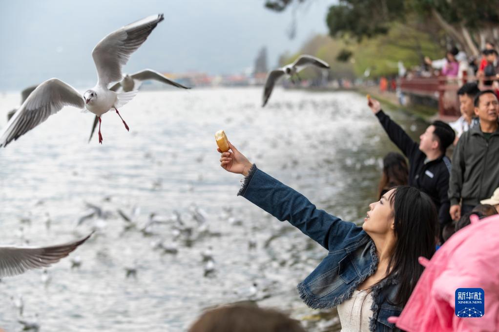 3月12日,游客在昆明海埂公園喂紅嘴鷗。
