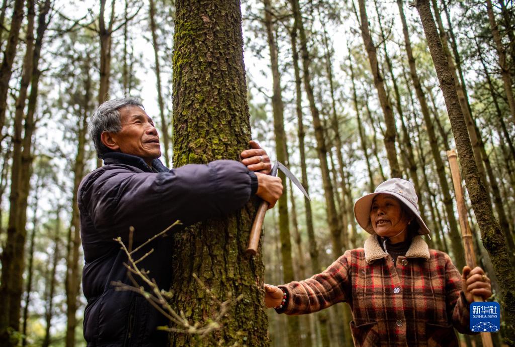 3月12日,護林員王石貴與妻子一起在山林間查看樹(shù)木生長(cháng)情況。