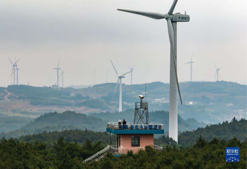 3月12日,護林員王石貴與妻子在花木山林場(chǎng)瞭望塔瞭望(無(wú)人機照片)。