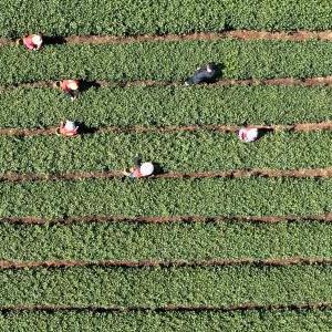 3月13日,龍井村的茶農在采摘西湖龍井“明前茶”(無(wú)人機照片)。
