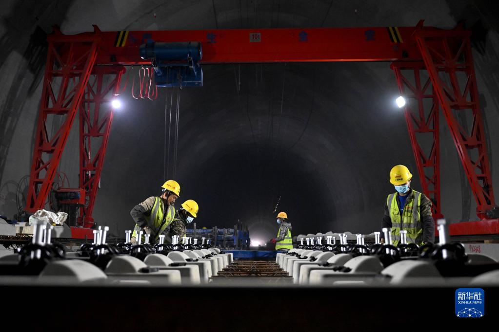 3月14日,在中鐵十一局池黃鐵路建設現場(chǎng),工人進(jìn)行無(wú)砟軌道施工作業(yè)。
