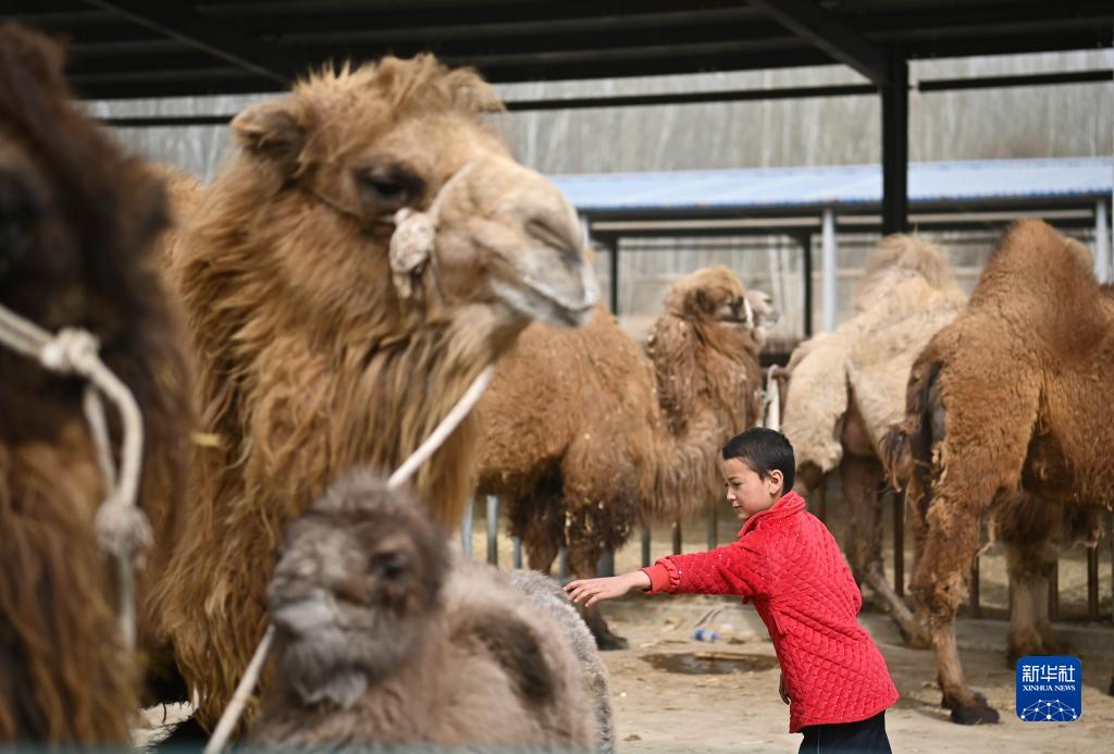 新疆莎車(chē)縣米夏鎮的牛羊巴扎上,一名兒童在觀(guān)看駱駝(3月12日攝)。