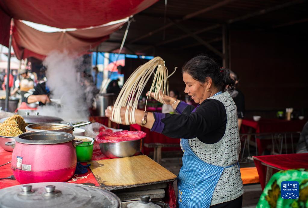 新疆莎車(chē)縣綜合巴扎上的商戶(hù)為顧客制作拉面(3月12日攝)。